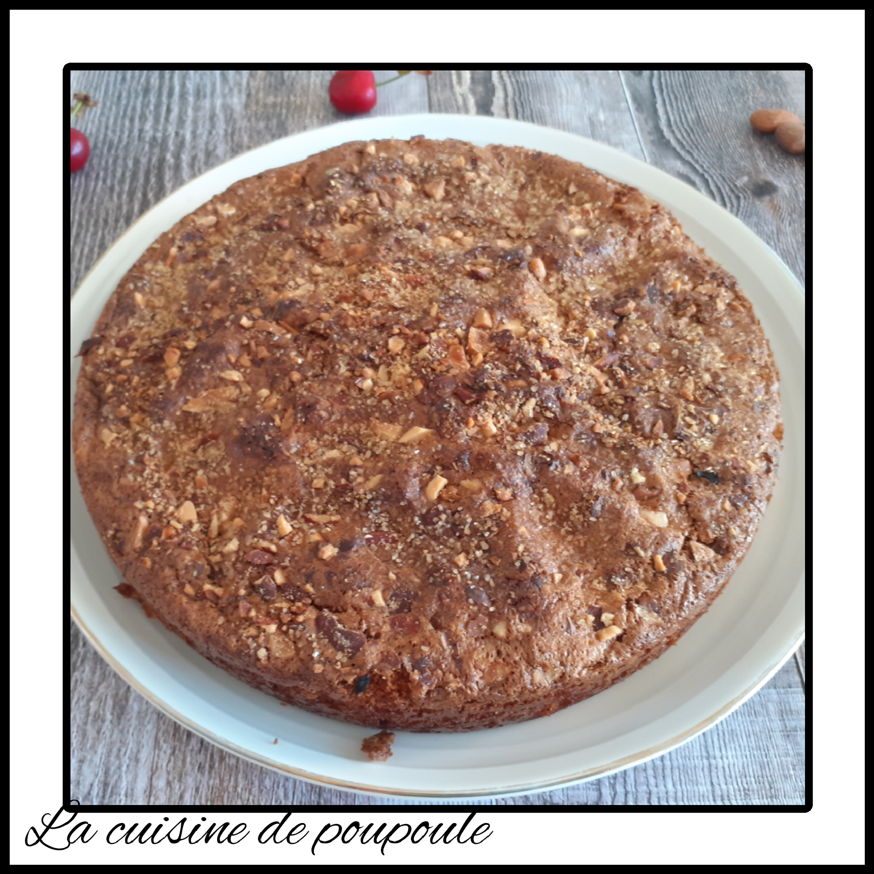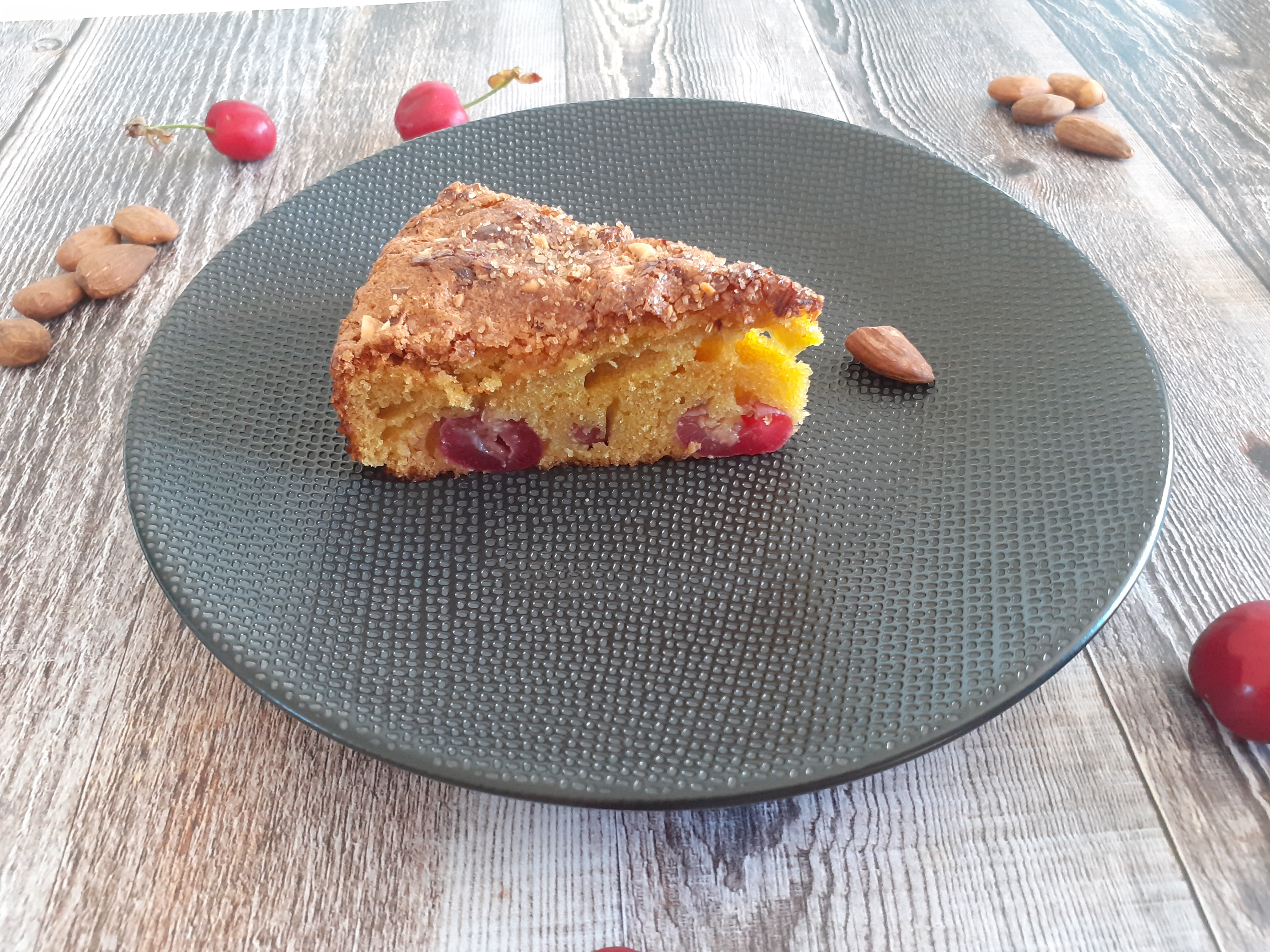 - Verser la pâte dans un moule diam20 cm en silicone pour moi. Disperser dessus les cerises, saupoudrer d’amandes concassées puis de cassonade.