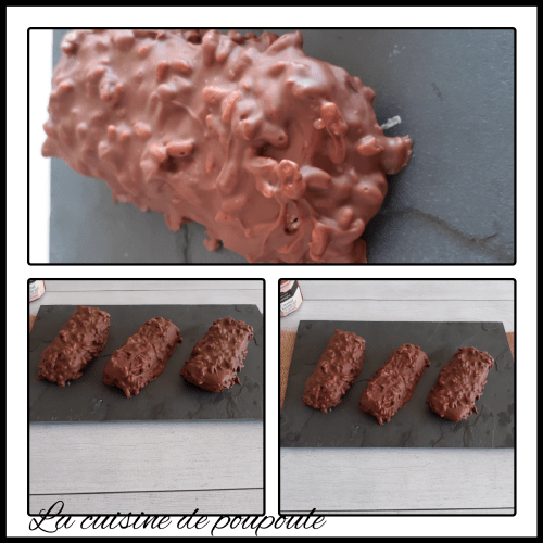 - Placer au réfrigérateur pour figer le chocolat (minimum 40 minutes). Puis décoller les barres et les disposer dans un plat. Savourer ou garder au réfrigérateur.
