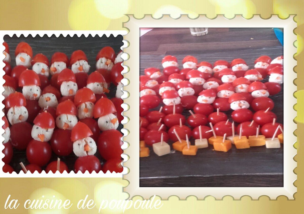 Coucou, Aujourd’hui je vous présente des pères noël. Ils ne sont pas top, mais ils étaient très bons. Ingrédients : – 6 tomates cerise ovales – 12 tomates cerise ronde – 12 billes de St môret (ou Moza) – 1 petite carotte – Cure dent – Graine de pavot Préparation : 1- Nettoyer et sécher vos tomates cerise 2- Couper vos tomates … Lire la suite Père noël (tomate cerise, St Morêt)