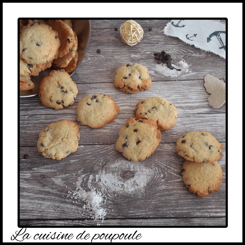 Je les ai réalisés à la demande de mon Léo car il voulait des cookies à la noix de coco. J’ai pris la recette chez Melly du blog Fisch custard un très beau blog. Merci mely ces cookies étaient trop bons. Je n’ai rien changé à la recette de Melly sauf de mettre des pépites de chocolat noir plutôt que du chocolat blanc.