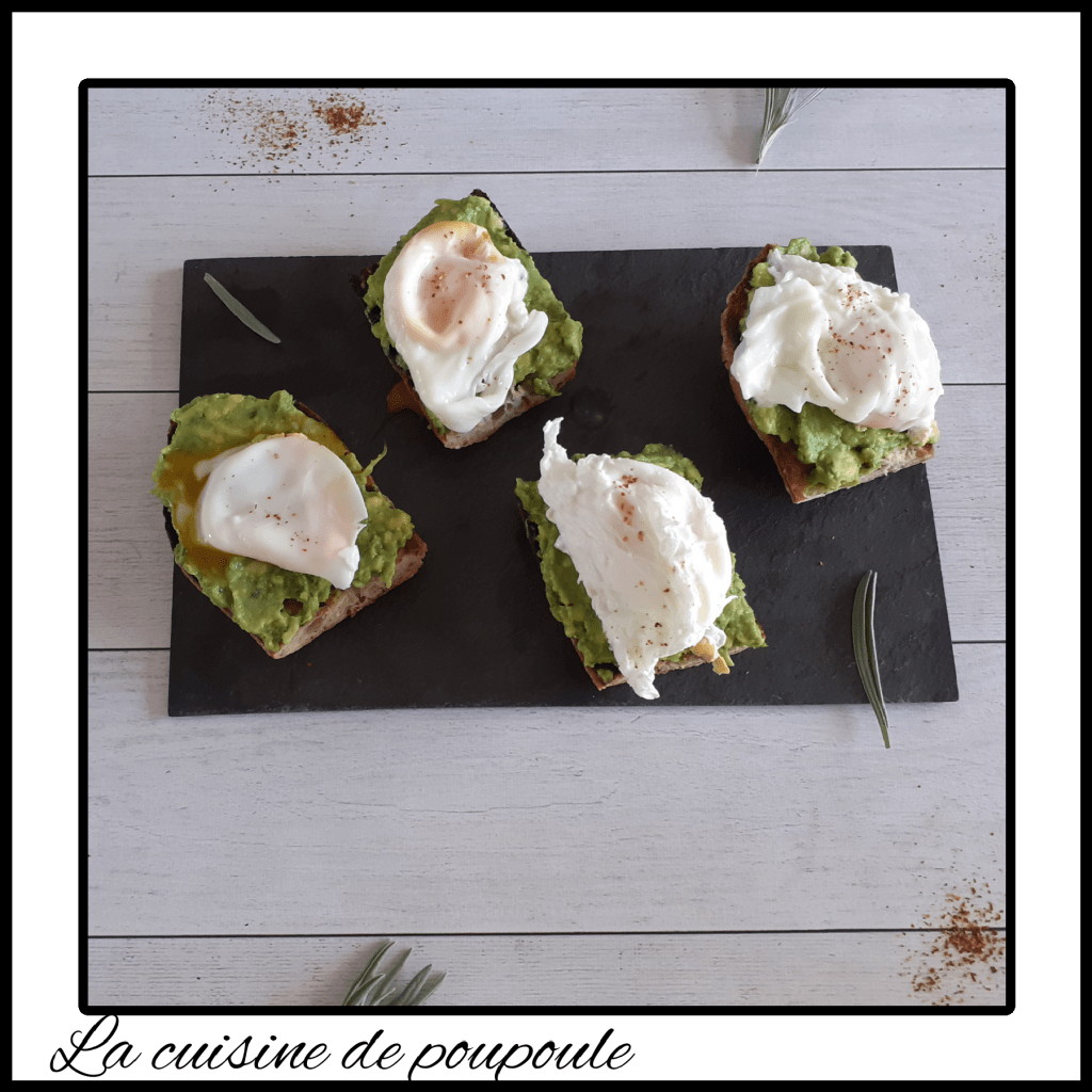 - Assembler les tartines : tartiner les tranches de pain grillées avec l’écrasé d’avocat, disposer les œufs pochés dessus. Saupoudrer de piment d’Espelette.