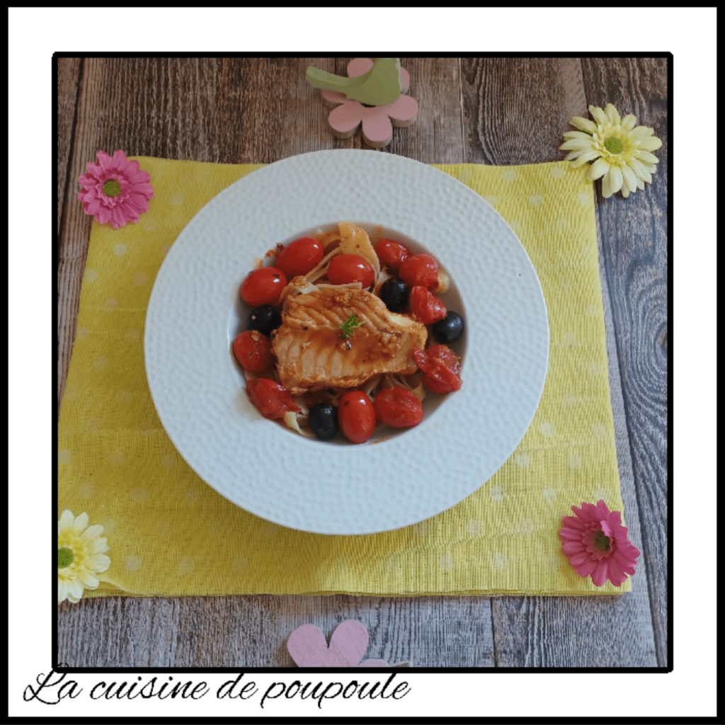 Cabillaud tomates & olives sur lit de tagliatelles
