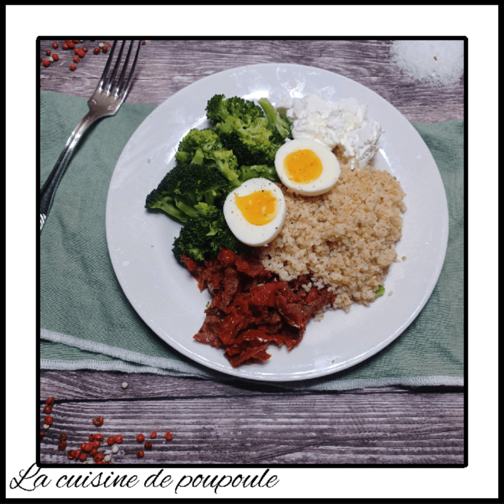 7. Dans une assiette creuse, ajoutez : le boulgour, le brocoli égoutté, la roquette, le fromage frais en morceaux, les tomates séchées et l’œuf écalé et coupé en deux.