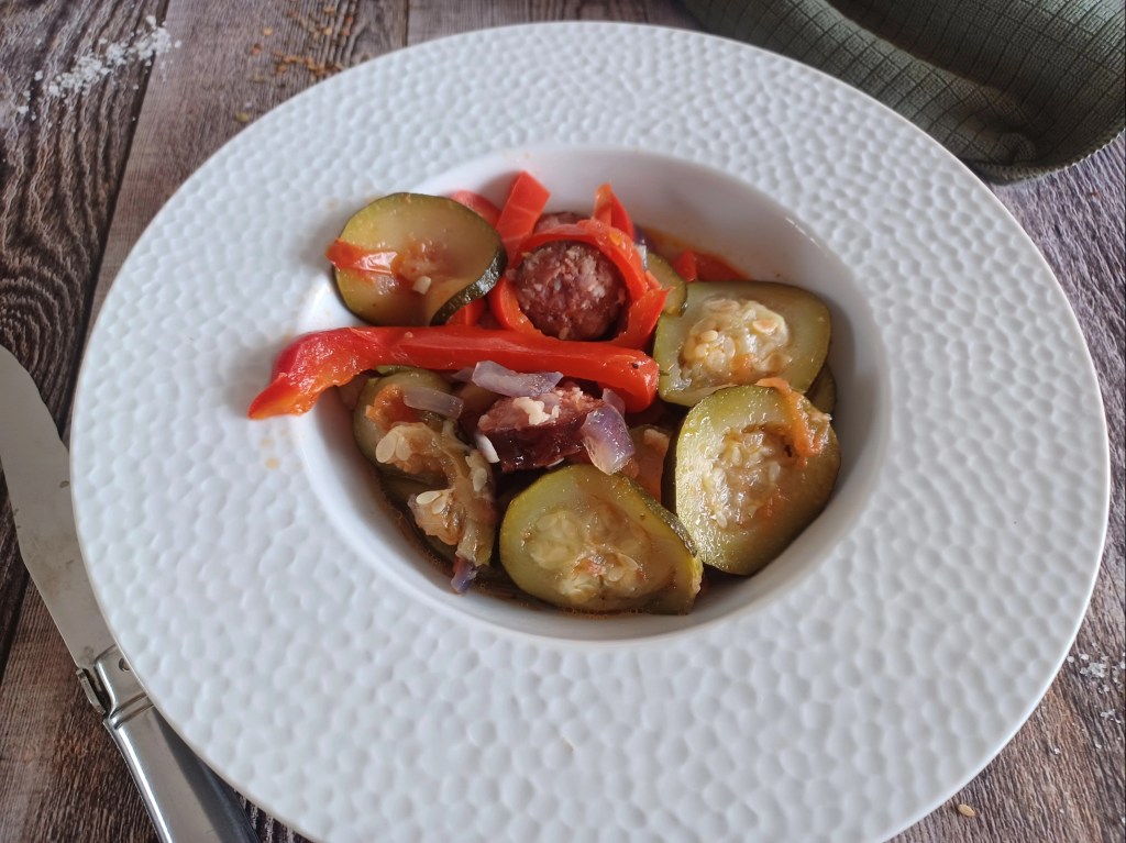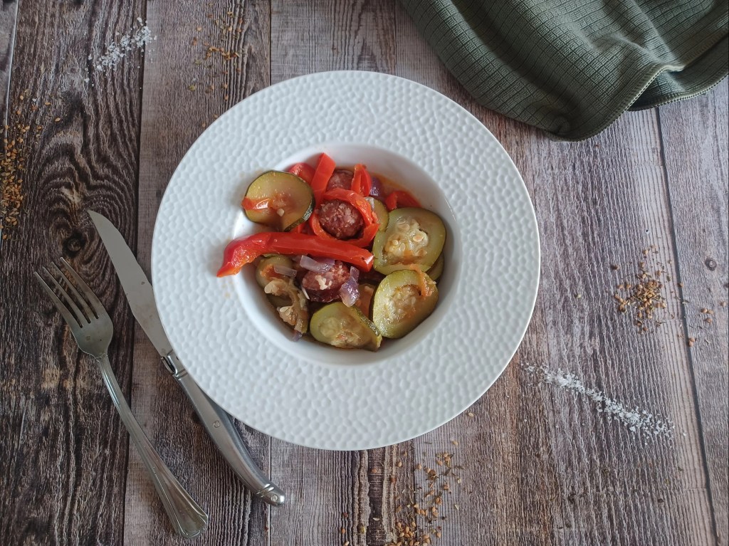 - Préparer vos ingrédients, éplucher et ciseler l’oignon, lave, épépiner vos poivrons et les couper en lamelles. Éplucher vos courgettes et les couper en rondelles. Couper vos saucisses en rondelles.