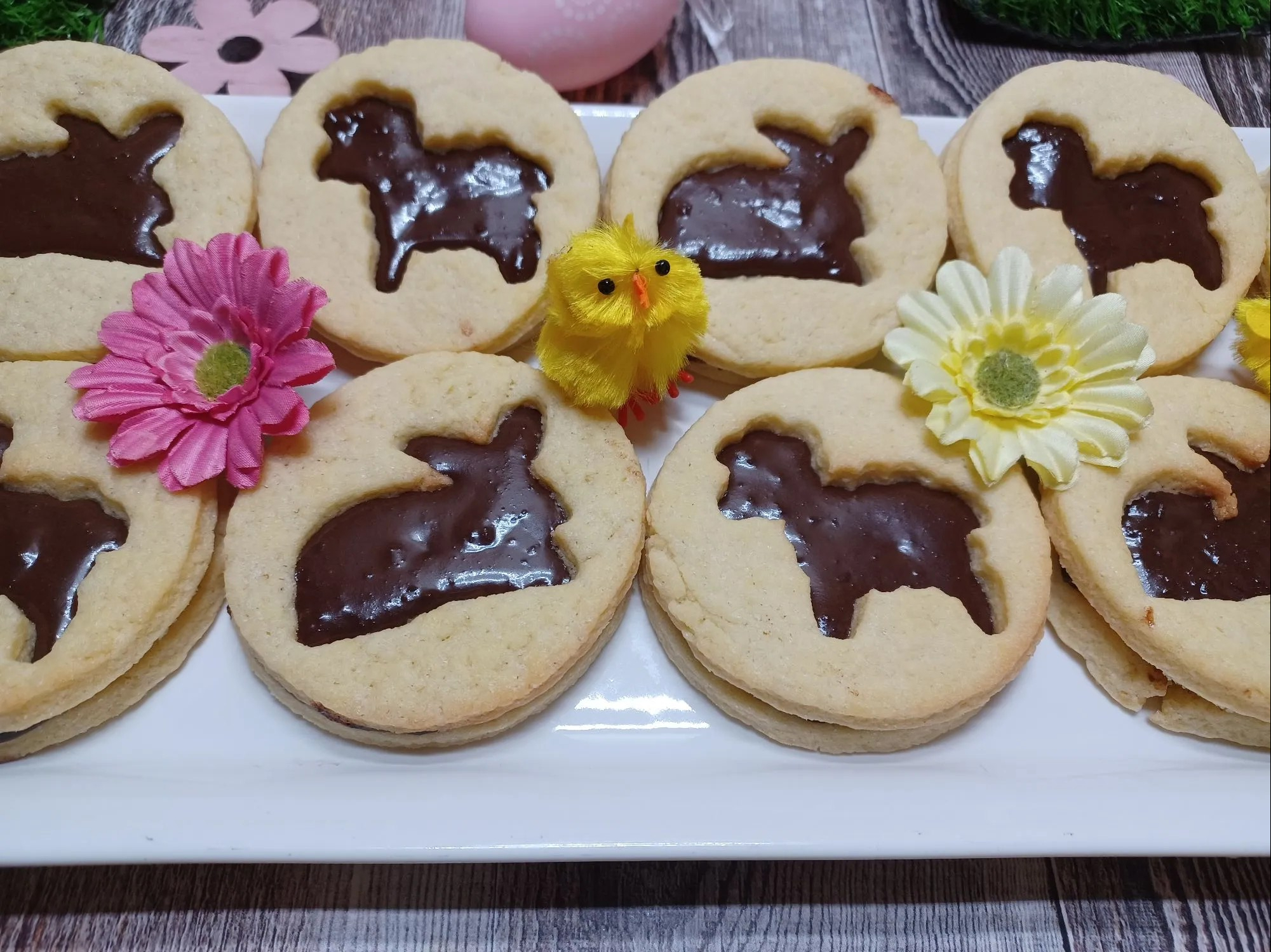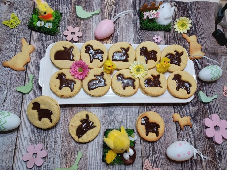 Tout d’abord, je vous souhaite un bon dimanche de Pâques. Je vous propose des petits biscuits faciles à faire et qui vont régaler vos gourmands. Pour plus de gourmandise, nous les avons enduits de chocolat et recouverts de petits bonbons avec mon Andy. Je vous souhaite une bonne chasse aux œufs. Ils n’ont pas fait long feu, j’ai dû en refaire pour pouvoir en offrir.
