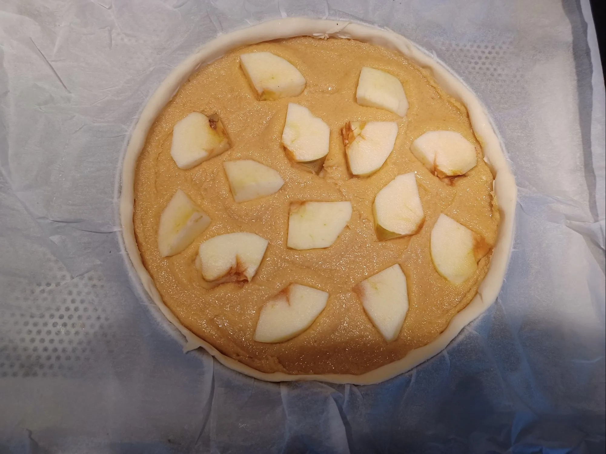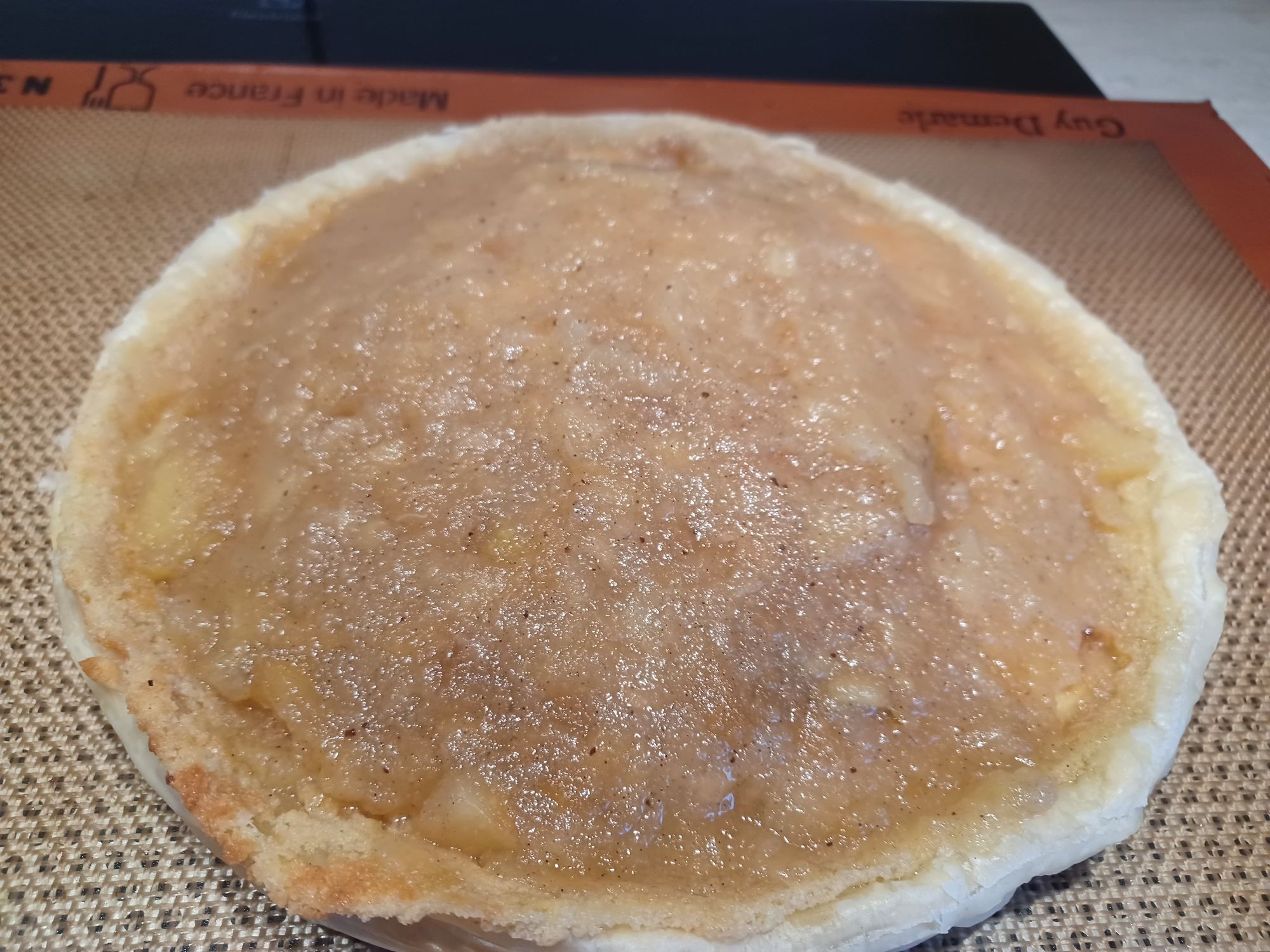 - Garnissez le fond de pâte feuilleté préalablement préparé (18 cm de diamètre), ajoutez les morceaux de pommes et enfournez dans un four préchauffé à 170°C pour 15 minutes de cuisson.