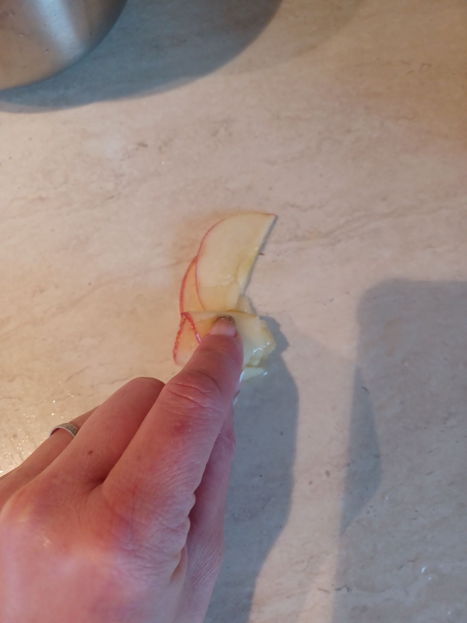 - Coupez très finement (à la main ou avec une mandoline) des lamelles de pommes rouges et vertes. La finesse des lamelles en va de la réussite de cette tarte!