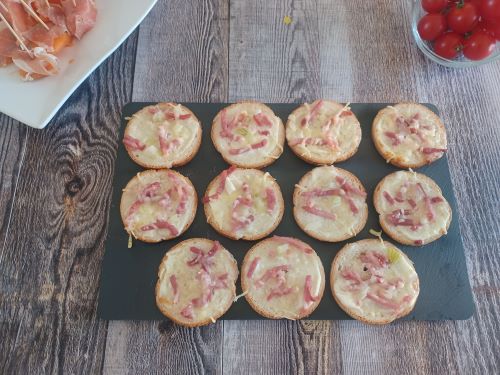 - Les tartiner de crème généreusement, ajouter des lardons de volaille, des lamelles d’oignon, et terminer par une pincée de fromage râpé.
