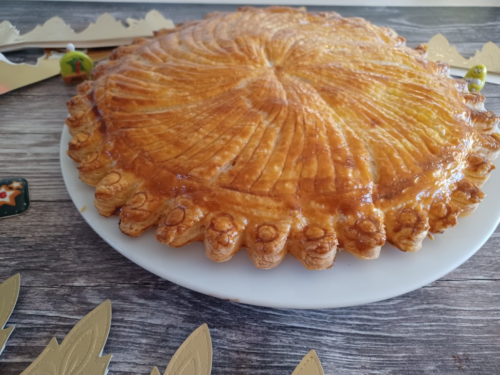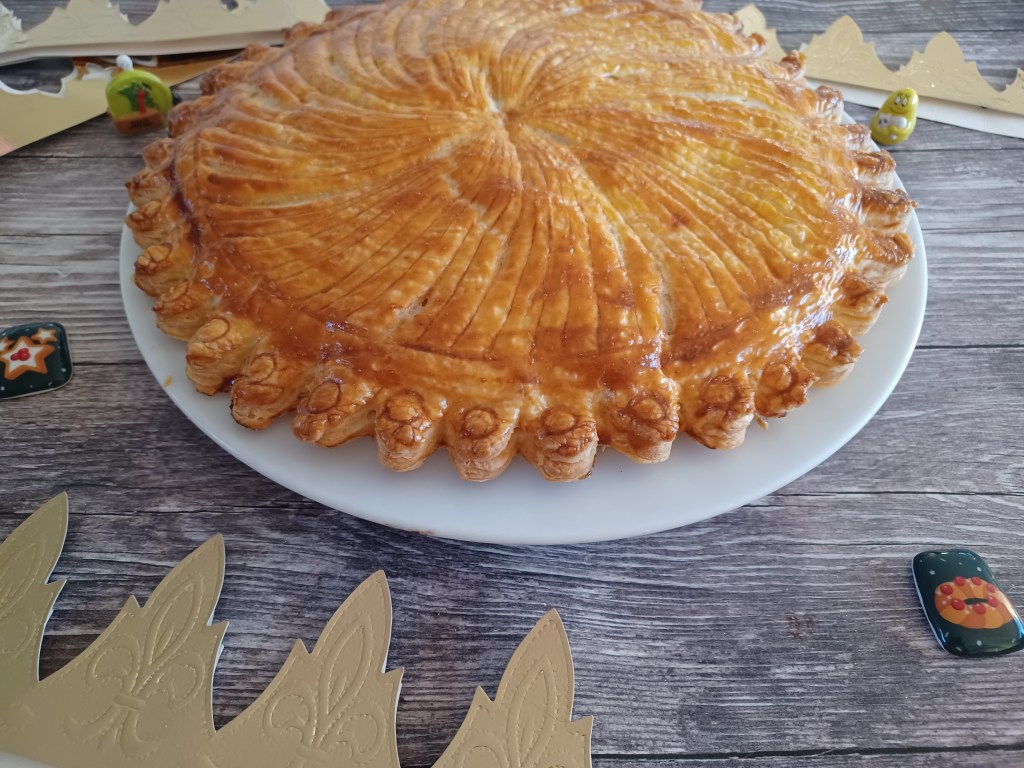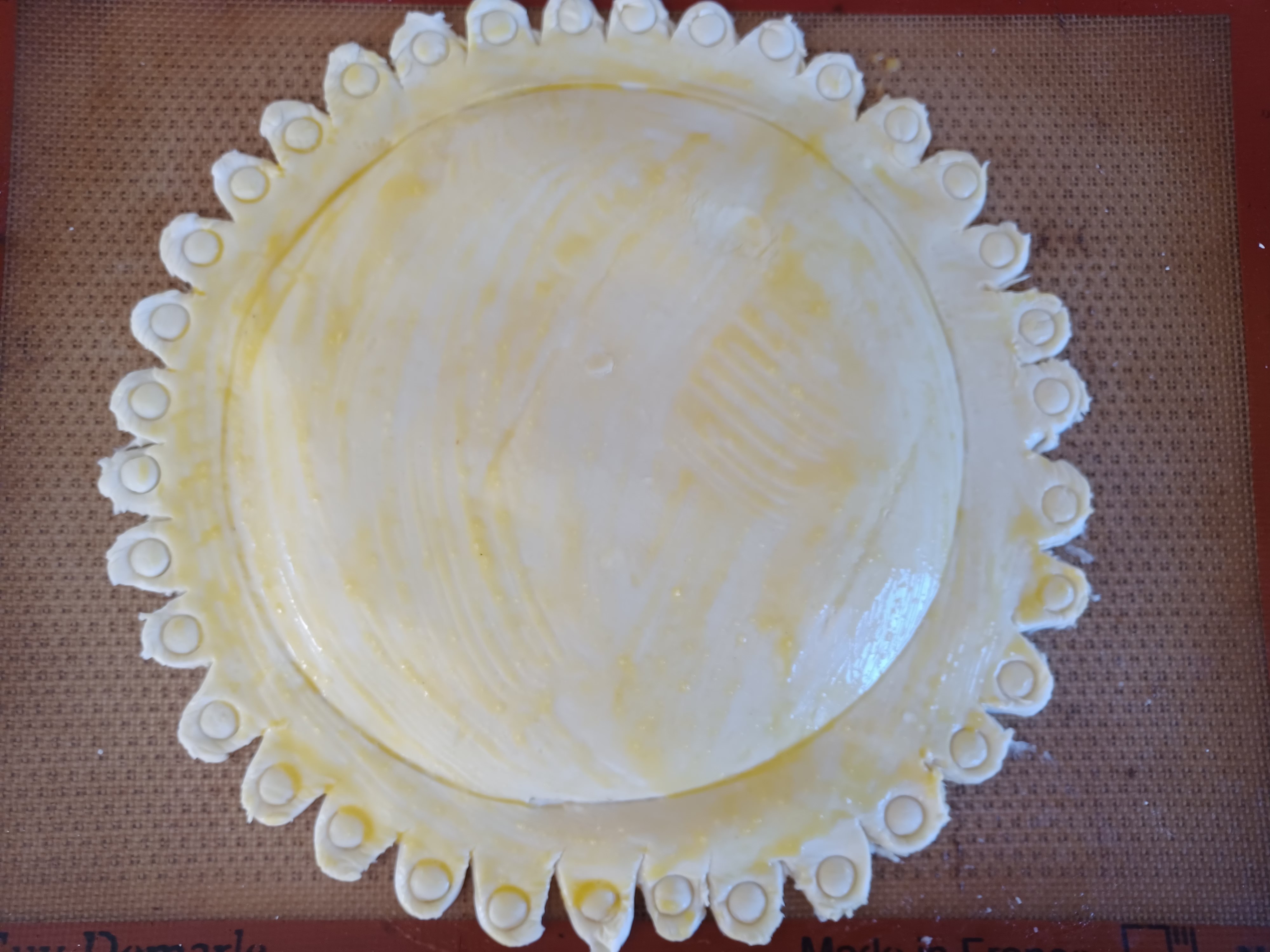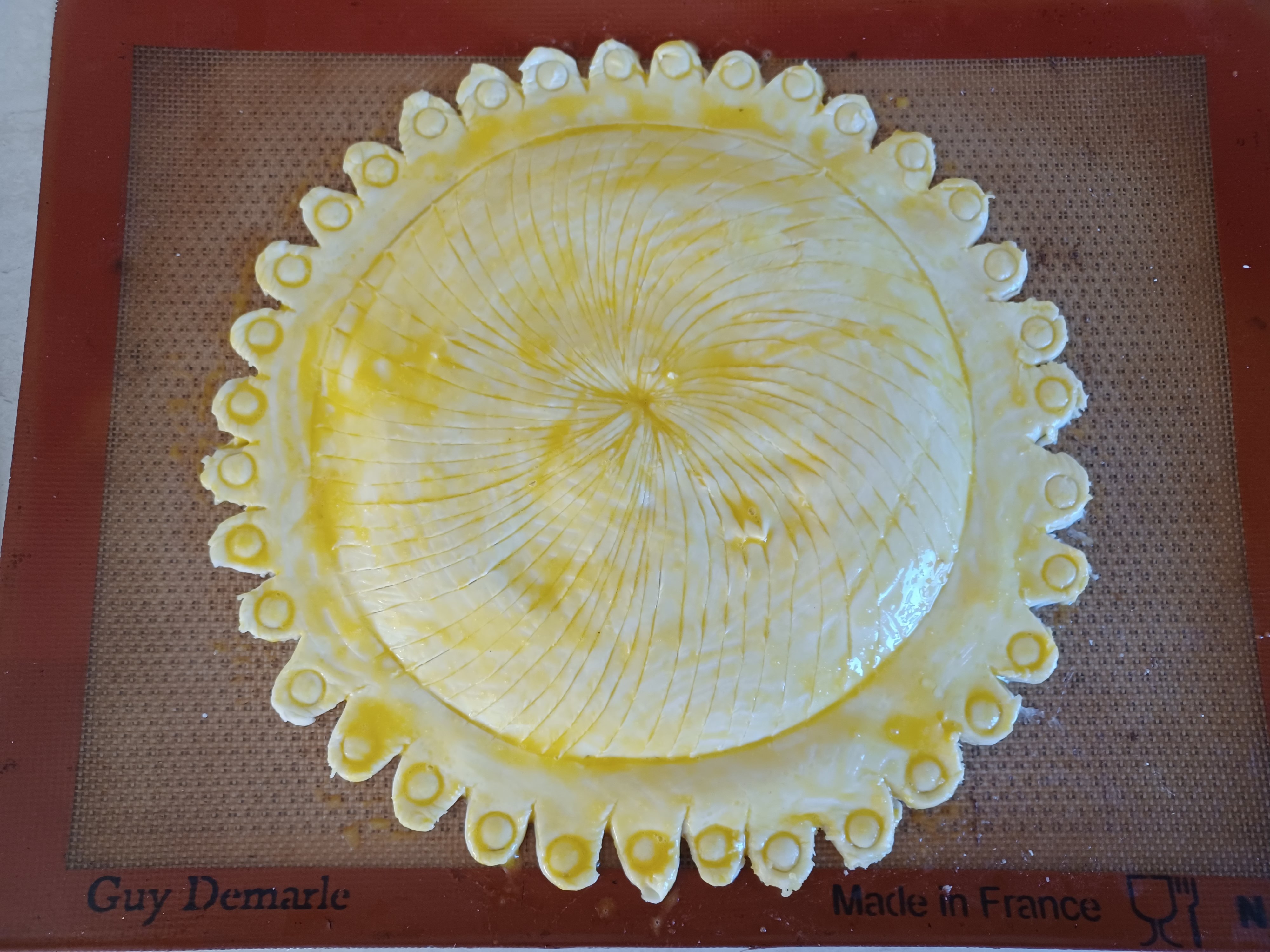 - Décorer à l’aide d’une pointe d’un couteau et dorez au jaune d’oeuf.