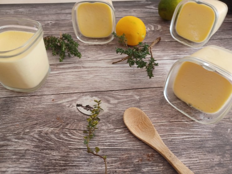 Je vous propose aujourd’hui une nouvelle recette de crème dessert. Moi j’ai beaucoup aimé, mes hommes beaucoup moins. Le mélange citron et thym est vraiment top. La texture de ces crèmes est parfaite. J’ai pris la recette dans mon livre Mes petits desserts light à la yaourtière.