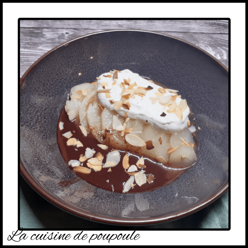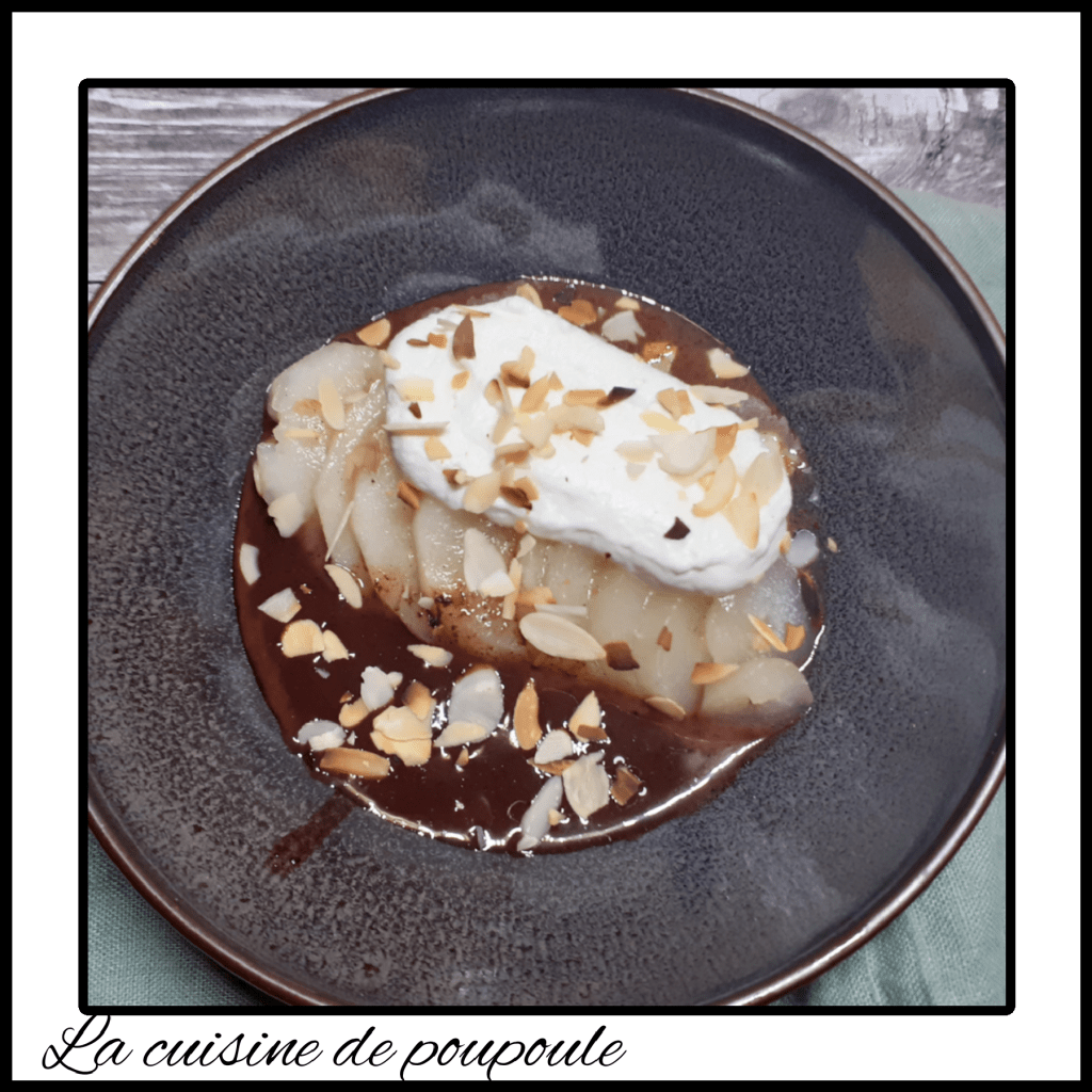 - Déposez les poires tranchées dans les assiettes, nappez de sirop pour les faire briller, versez sur le côté une cuillerée de sauce chocolat et une pointe de chantilly, ajoutez quelques amandes effilées.