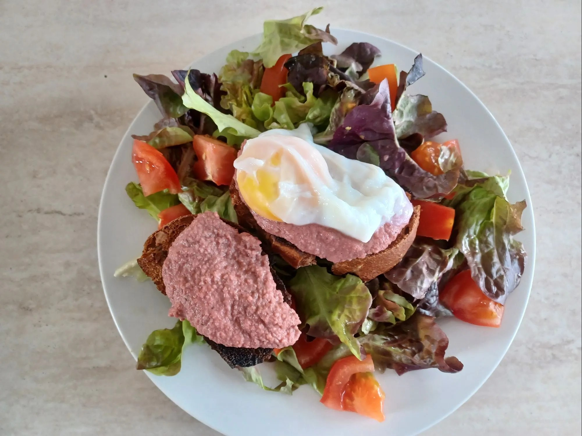 11. Tartinez du pain avec l’houmous de betterave. Déposez les œufs pochés dessus.