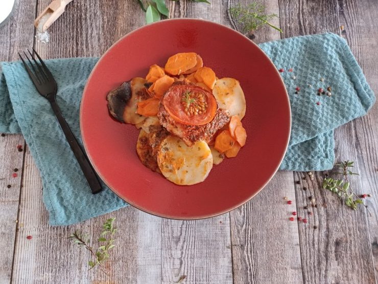 4. Dans un grand plat à gratin (ou deux), verser un beau filet d’huile d’olive et disposer dans le fond les rondelles de carottes et de pommes de terre.