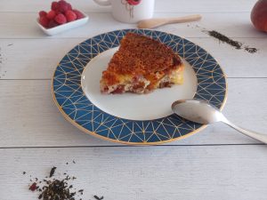 Je vous propose aujourd’hui un gâteau très gourmand que j’ai pris dans mon livre » Simple » du chef Ottolenghi. Ce gâteau nous a régalés, on profite encore des framboises du jardin et des pêches, la saison est bientôt finie. Je vous recommande ce gâteau.
