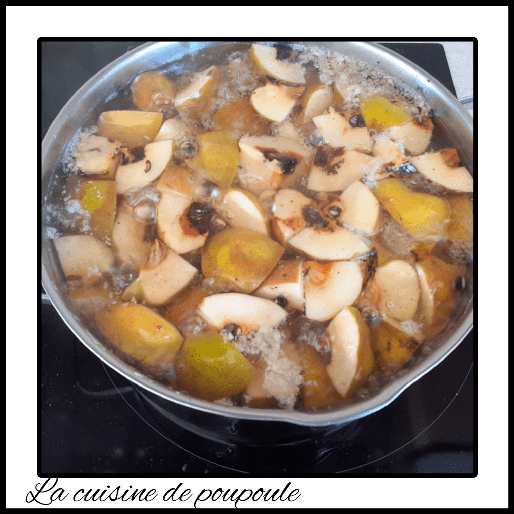 - Faites les cuire à feu moyen et testez leur cuisson en les piquant avec un couteau : comme les patates, si le coings glisse sur la lame, le coing est cuit.
