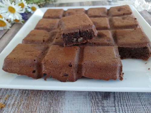 - Versez dans un moule carré et enfournez à 180° 20/25 min à surveiller. Pour vérifier planter la pointe d’un pic à brochette s’il reste quelques petits morceaux accrochés (pas liquide) c’est que c’est bon.