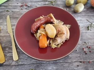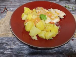- Ajoute les oignons émincés et les lardons fumés crus (ils cuiront au four).