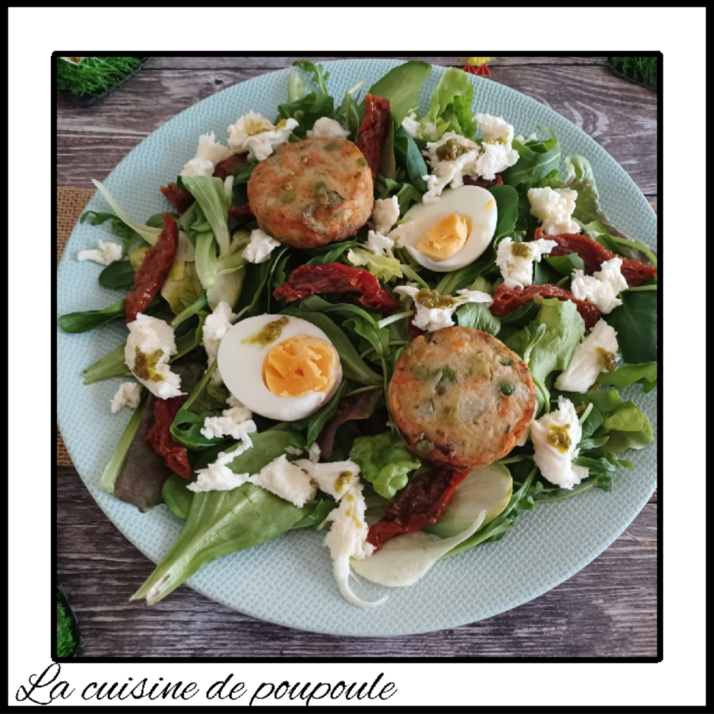 - Dans une assiette, ajoutez la salade, les galettes de légumes, les tomates, la mozzarella déchirée en morceaux, les œufs coupés en deux et la sauce au pesto. Salez et poivrez. C’est prêt.