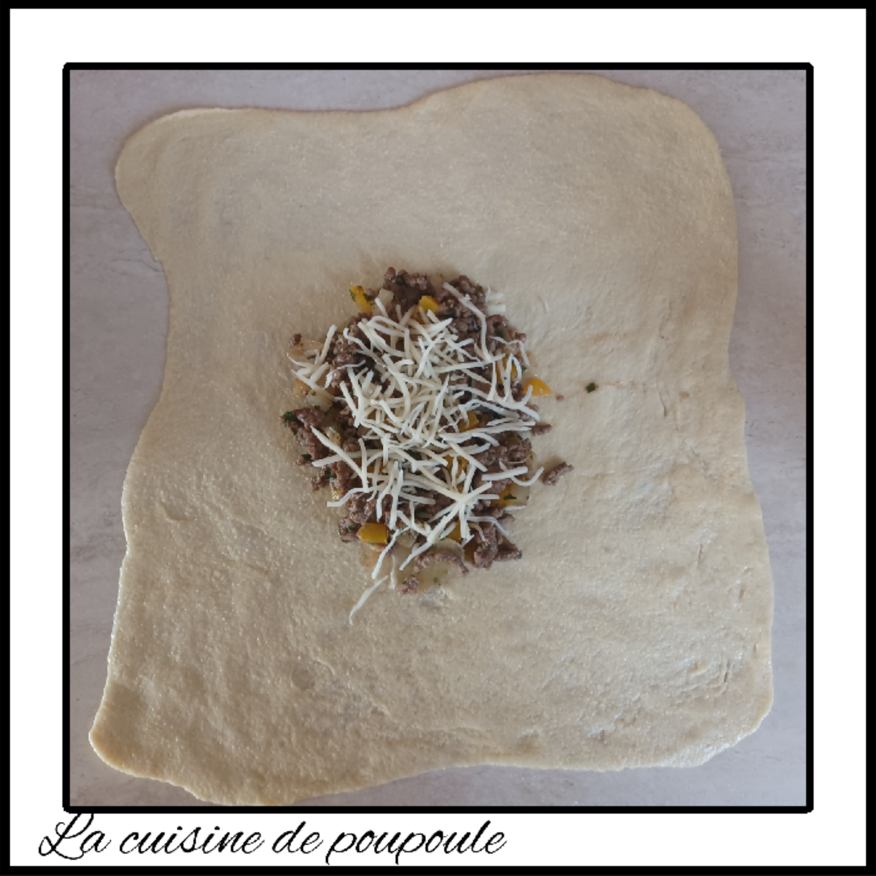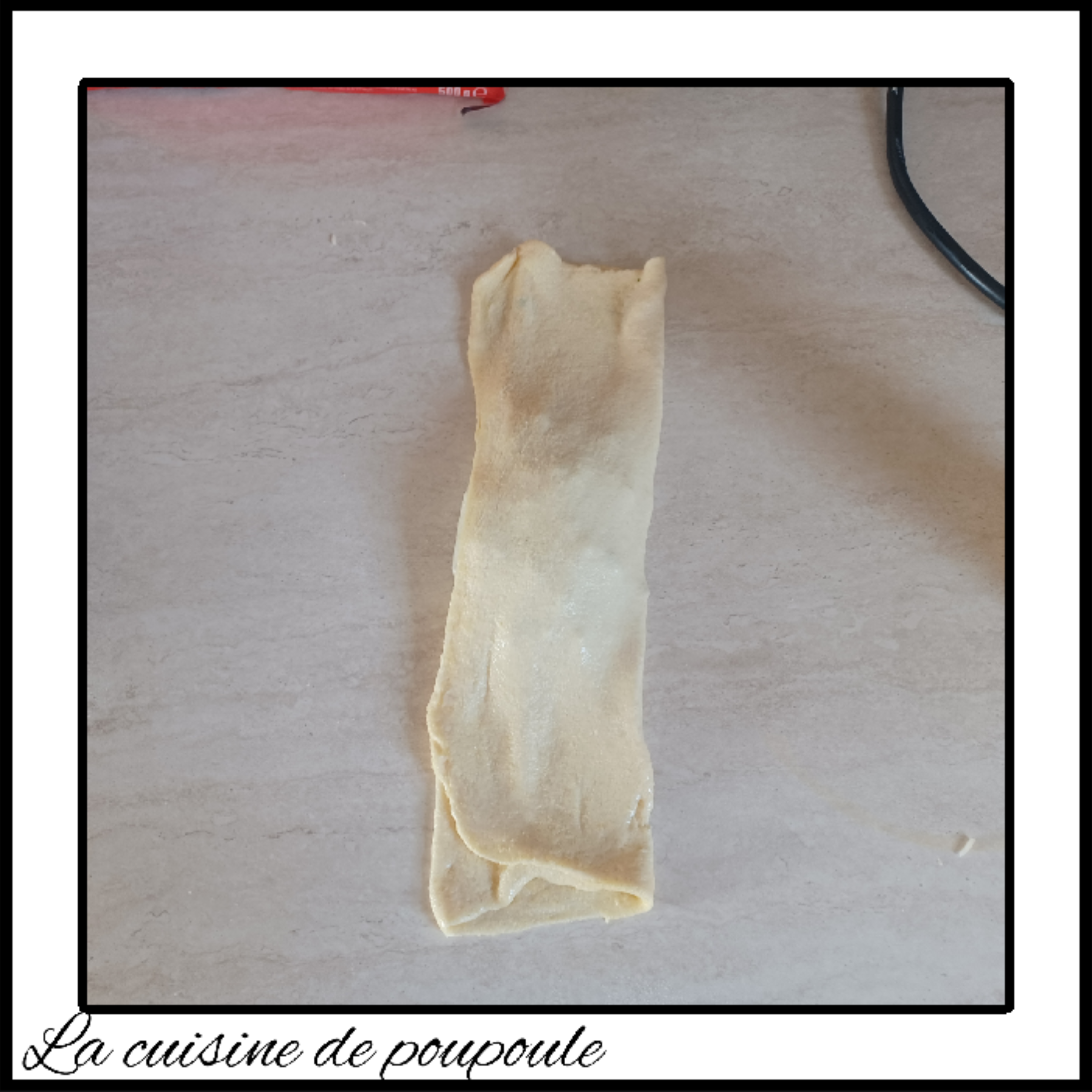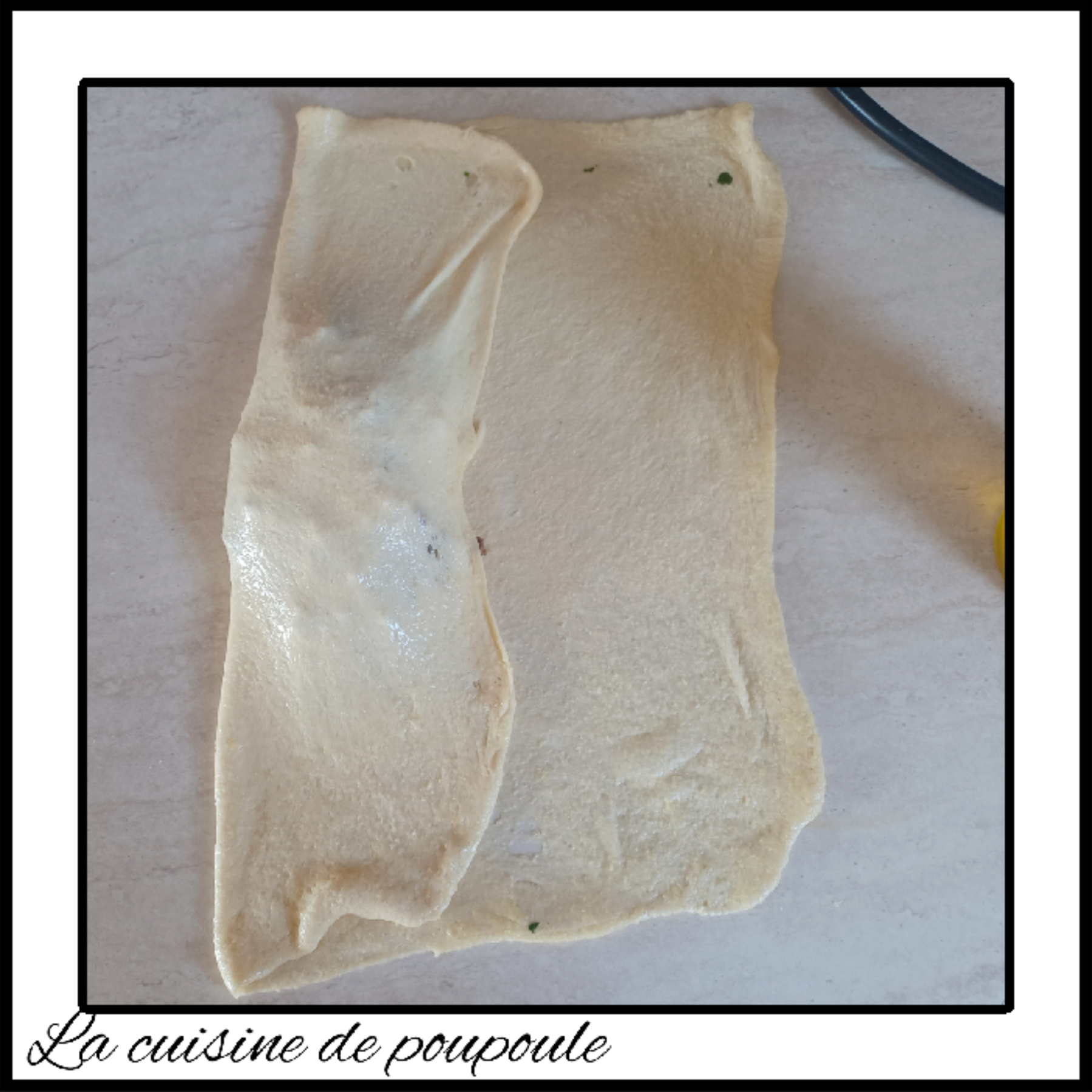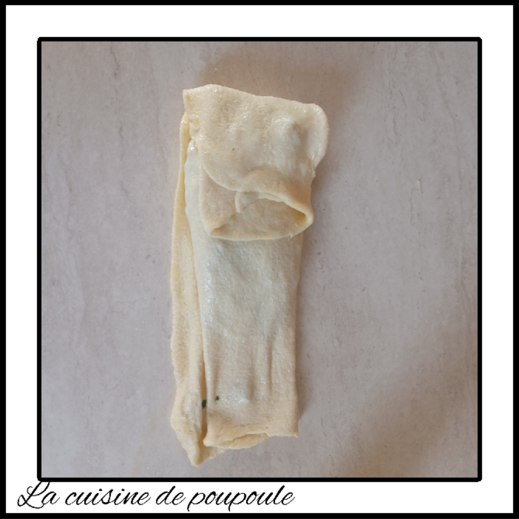 puis du côté droit qui se glisse en dessous pour renforcer le bas de la crêpe afin que la farce ne transperce pas la pâte pendant la cuisson, vous obtiendrez ainsi un joli carré. Placez ce dernier sur un plan de travail huilé un plateau en attendant de façonner le reste des crêpes.