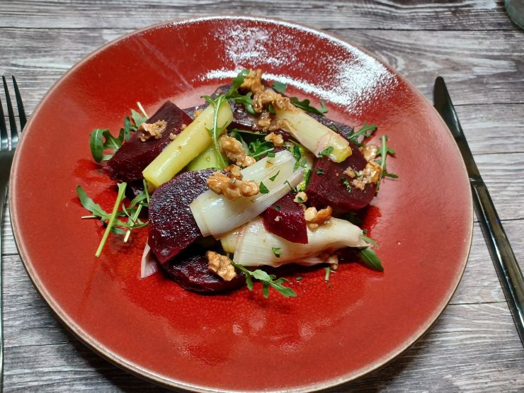 - Assemblez la salade. Répartissez la moitié des betteraves sur un plat, recouvrez de roquette, puis la moitié des poireaux, ajoutez le reste de betteraves et terminez par le reste de poireaux et de roquette.