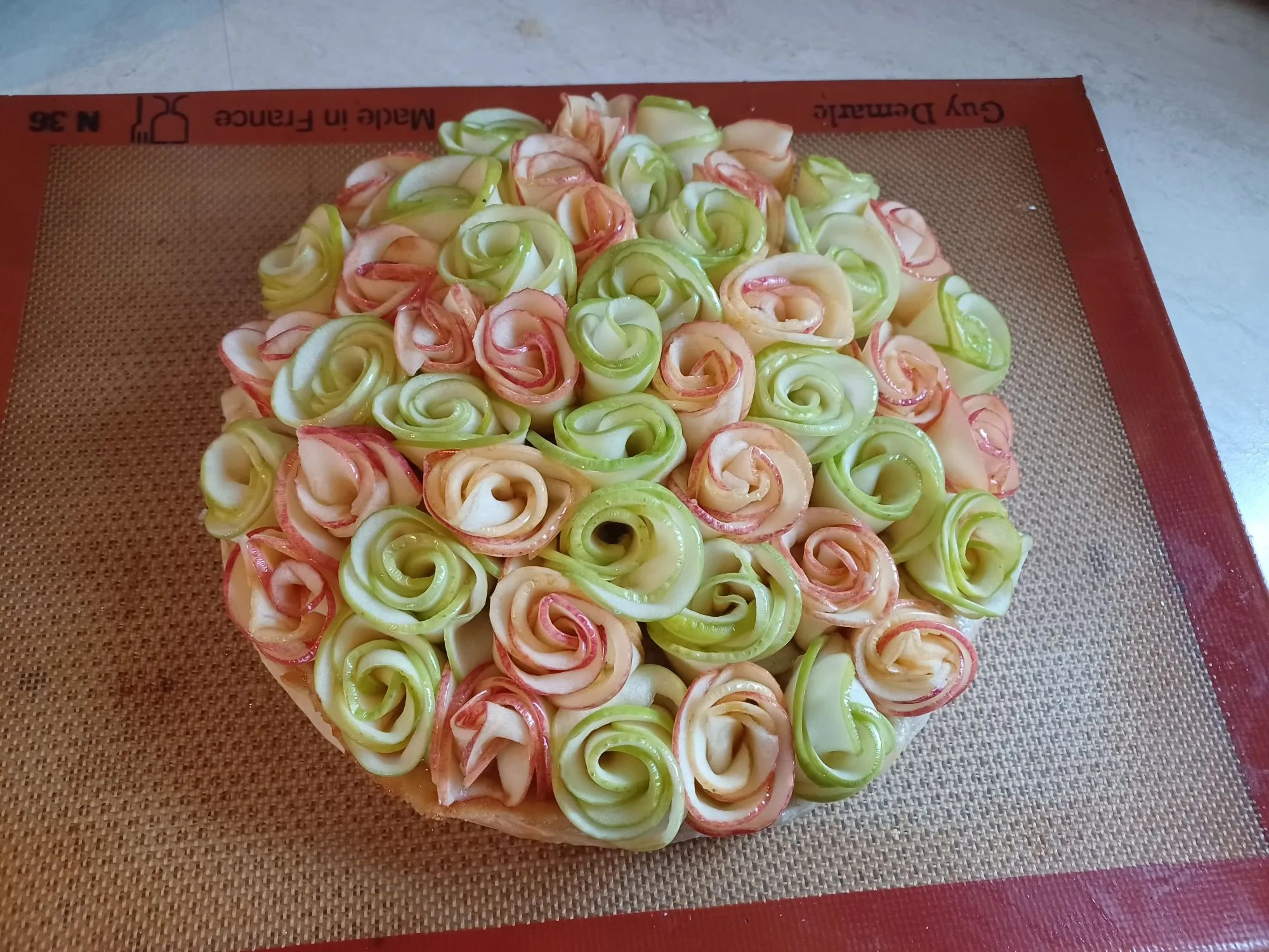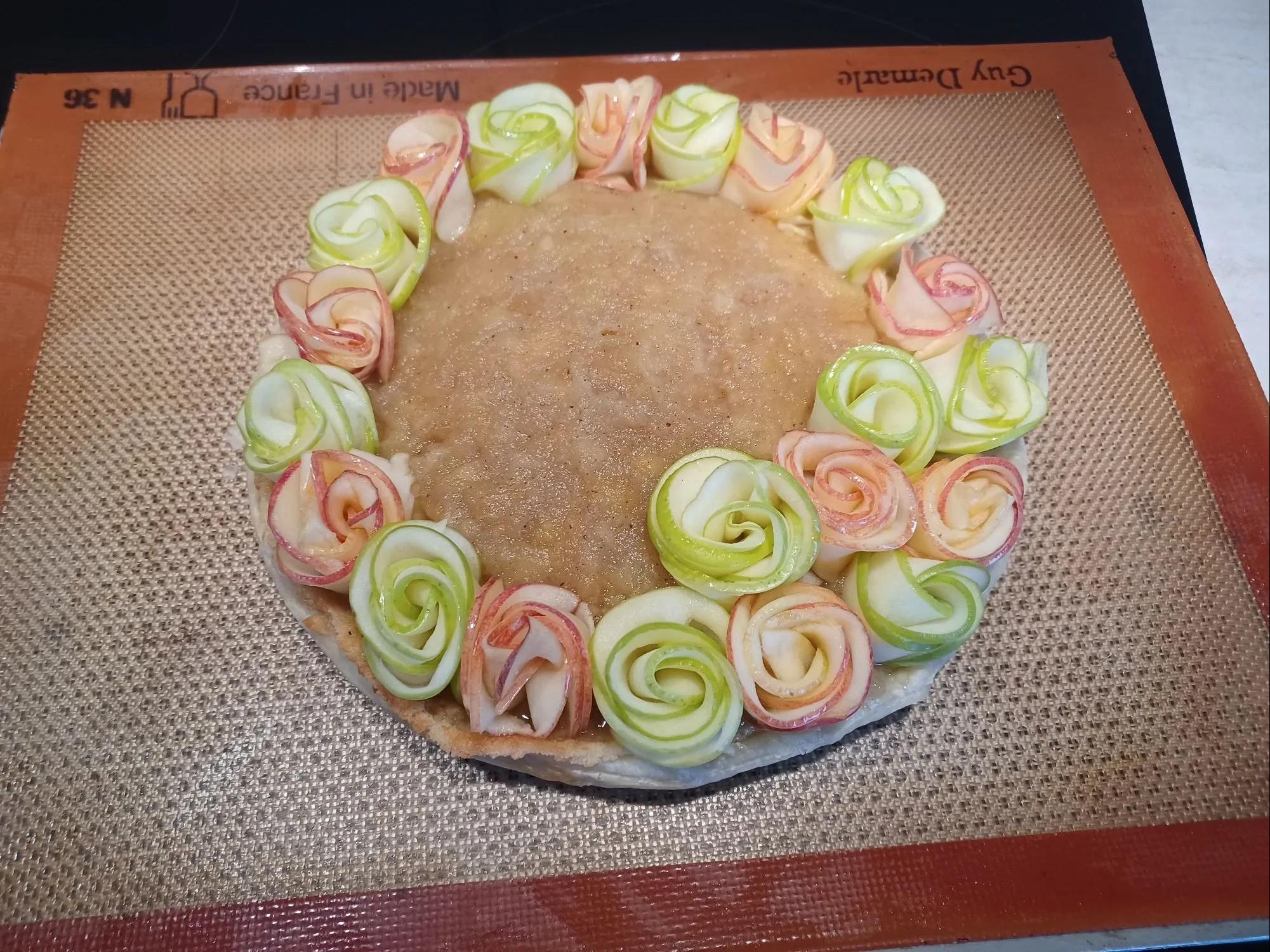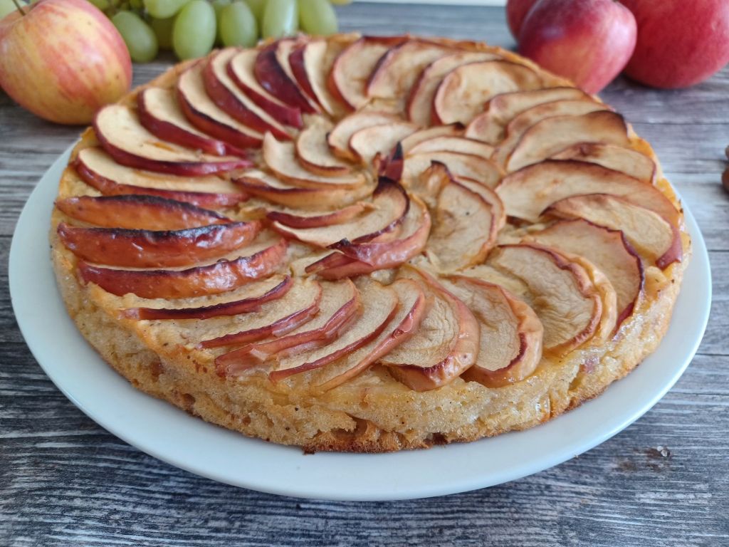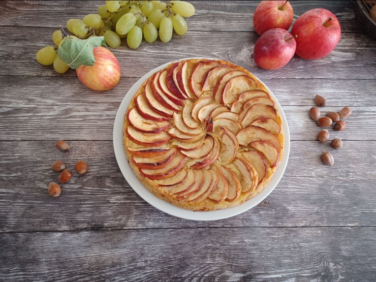 - Versez la pâte dans le moule, disposez harmonieusement les pommes pelées et coupées en fines tranches sur la pâte sans les enfoncer.