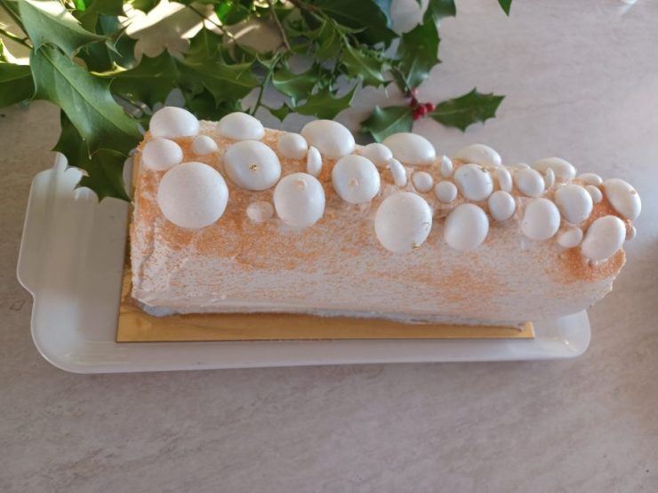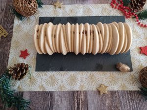 Je vous propose la 4ème bûche que j’ai faite pour Noël. J’ai pris la recette dans mon livre Bûches de Christophe Felder et Camille Lesecq. Les saveurs de cette bûche ont bien plu. Cette bûche se compose de trois biscuits, une mousse et deux inserts, cette bûche aux saveurs de poire, caramel et vanille est bien gourmande mais malgré tout très délicate et légère (mention spécial pour le biscuit moelleux à l’ancienne, vraiment excellent !). Voilà donc une bûche qui demande un peu d’organisation mais qui en vaut vraiment la peine Je clôture avec cette bûche les recettes de fêtes pour l’année 2024.