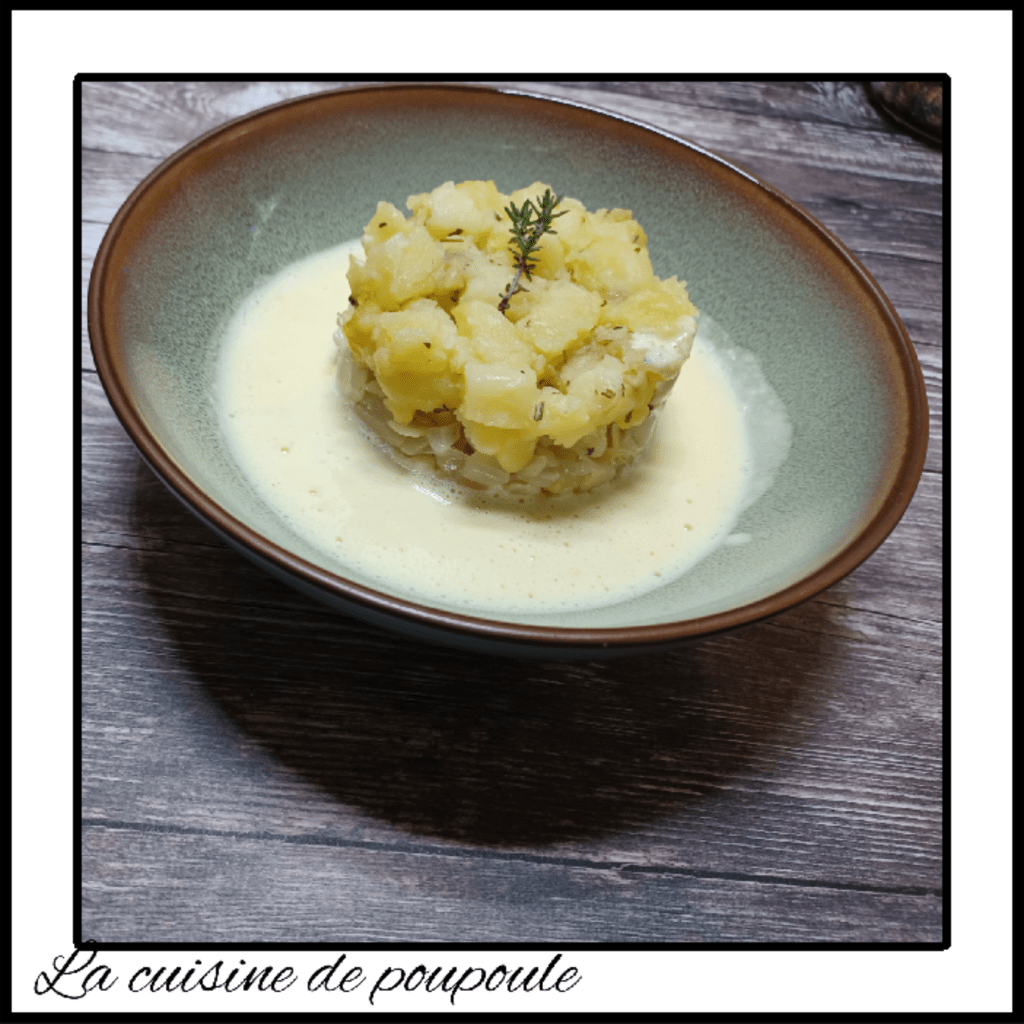 - Préparez les assiettes, creuses de préférence, prenez une cercles, déposez l’écrasé de pommes de terre dans le fond. Mettez les oignons dessus puis les pommes de terre en brunoise. Retirez le cercle et versez la sauce dans le fond.