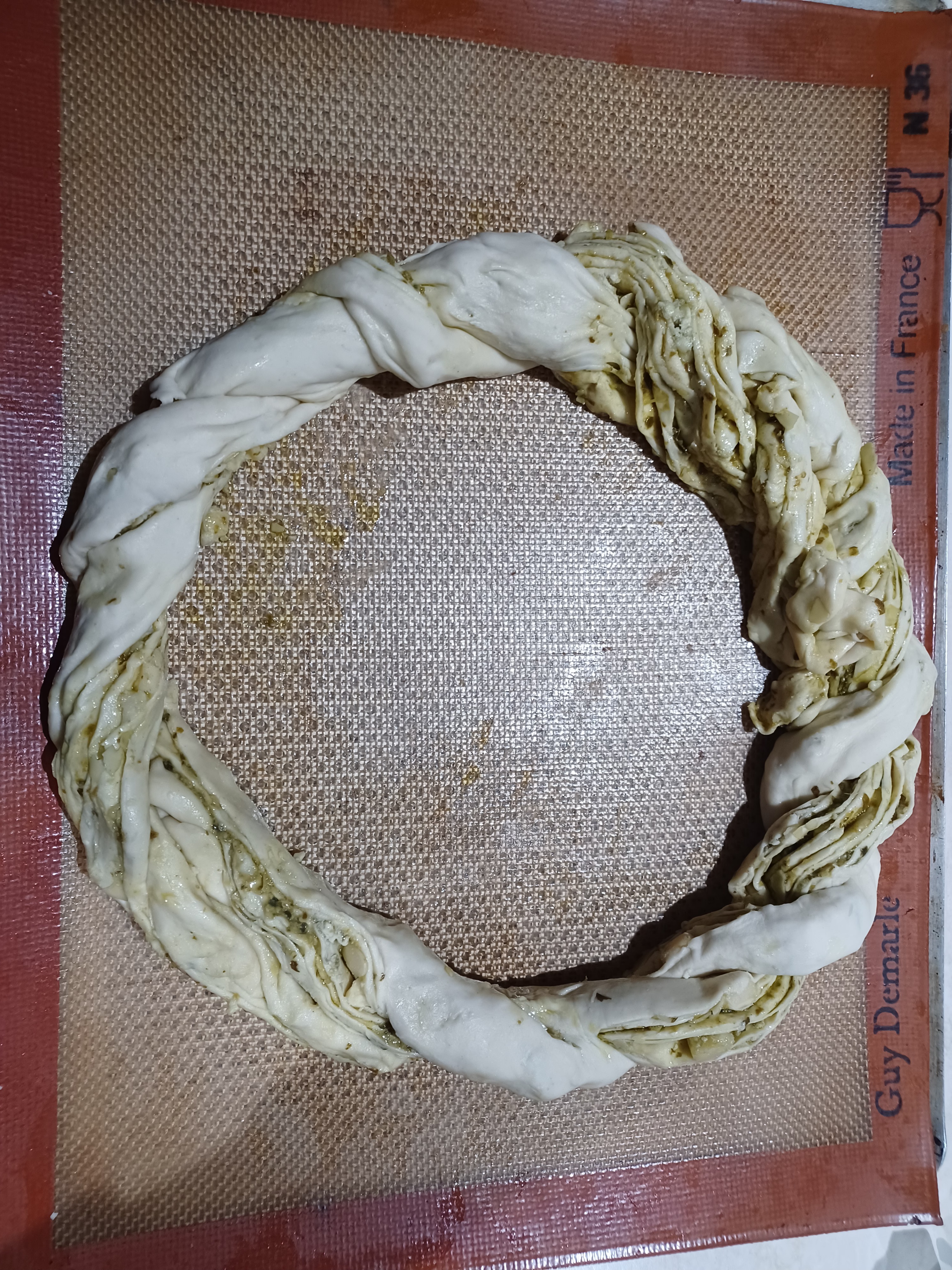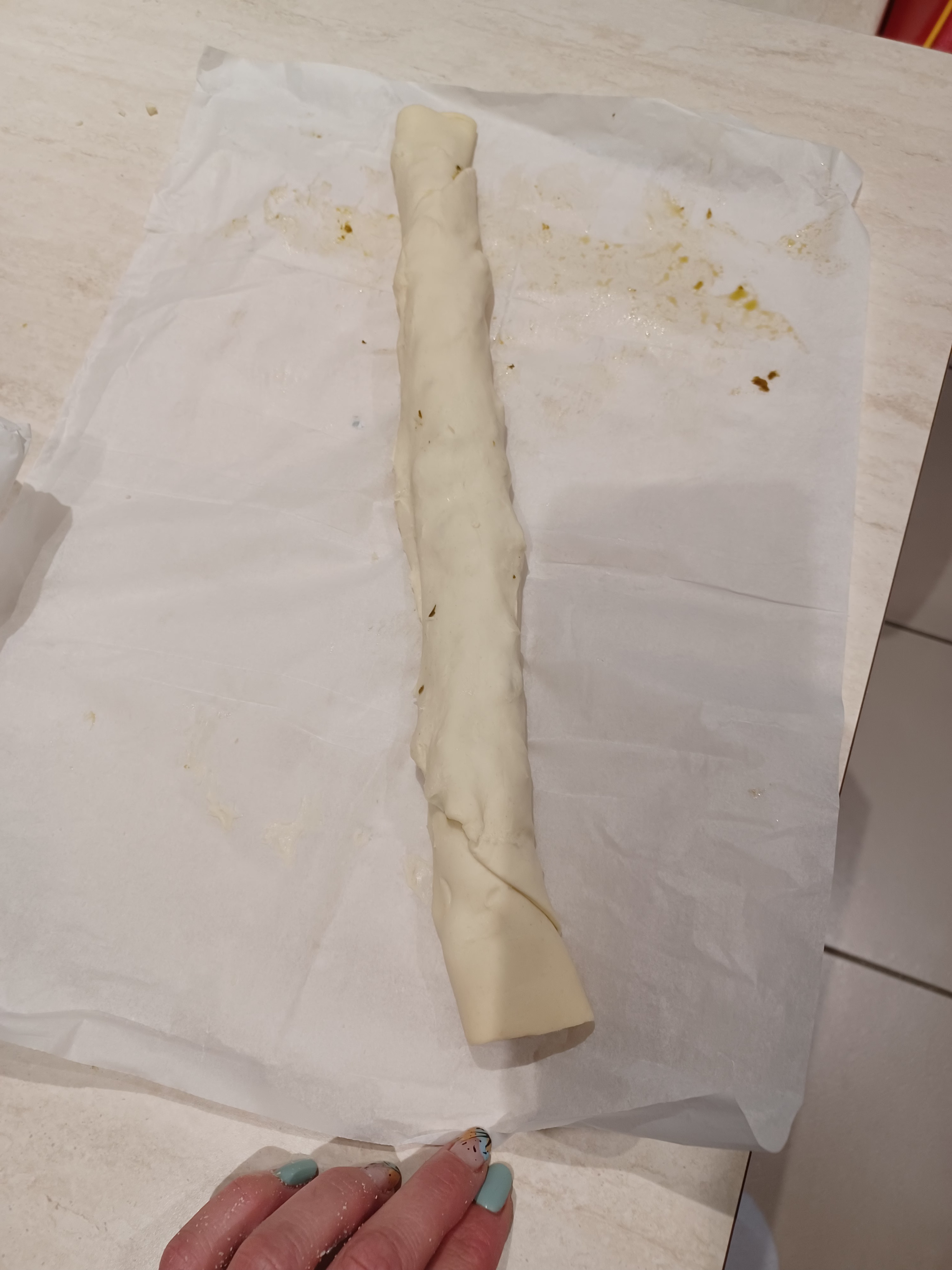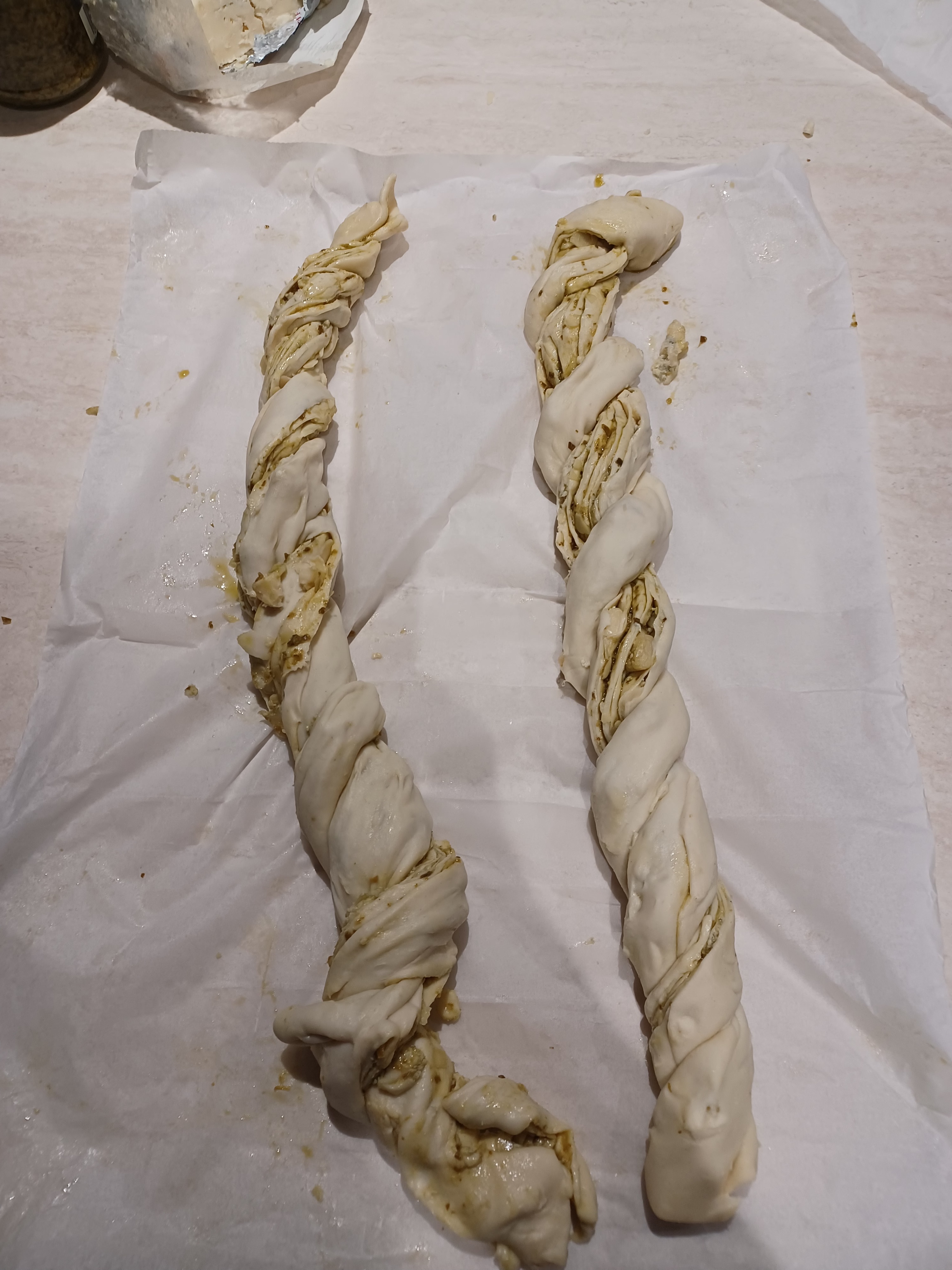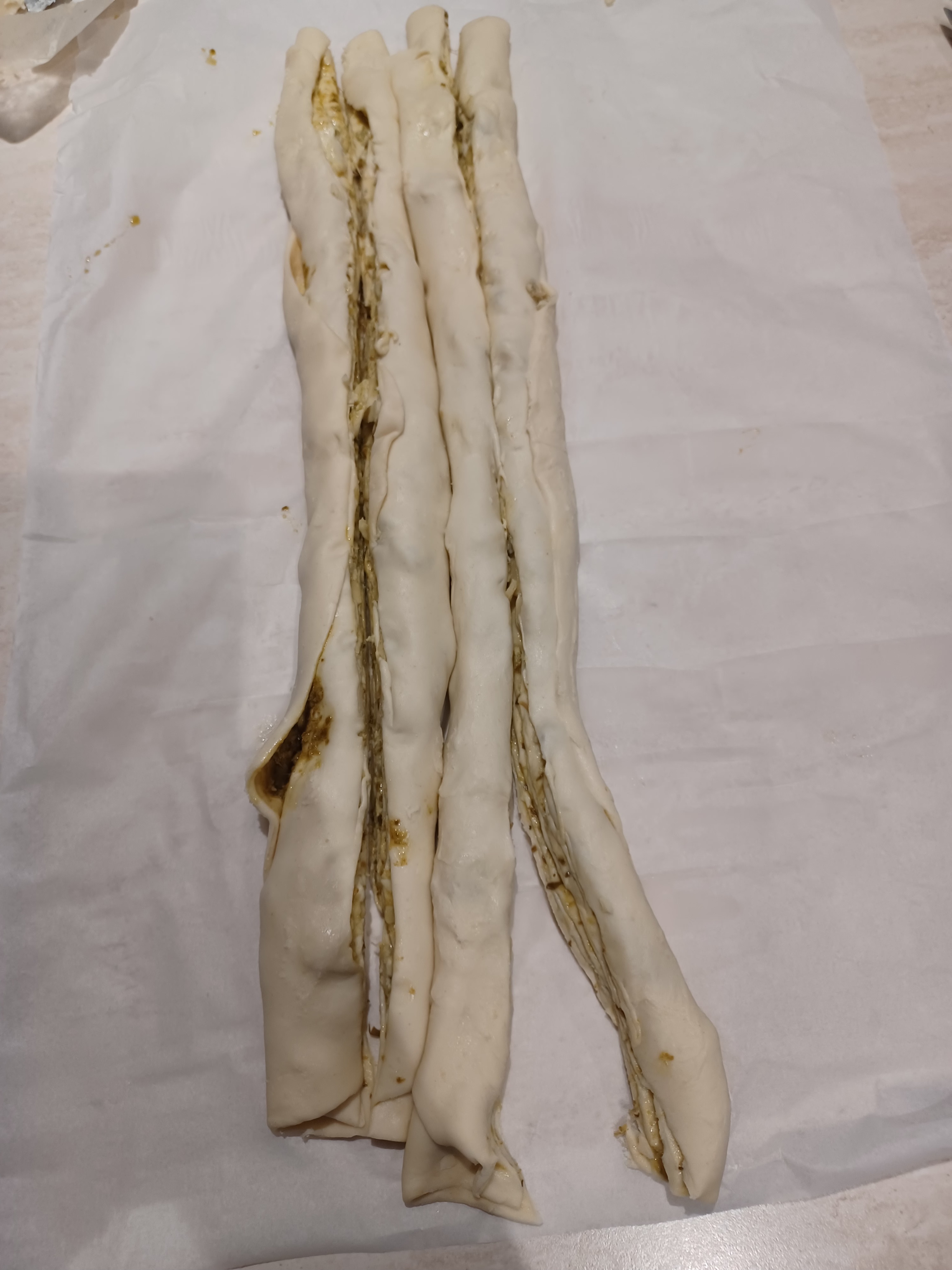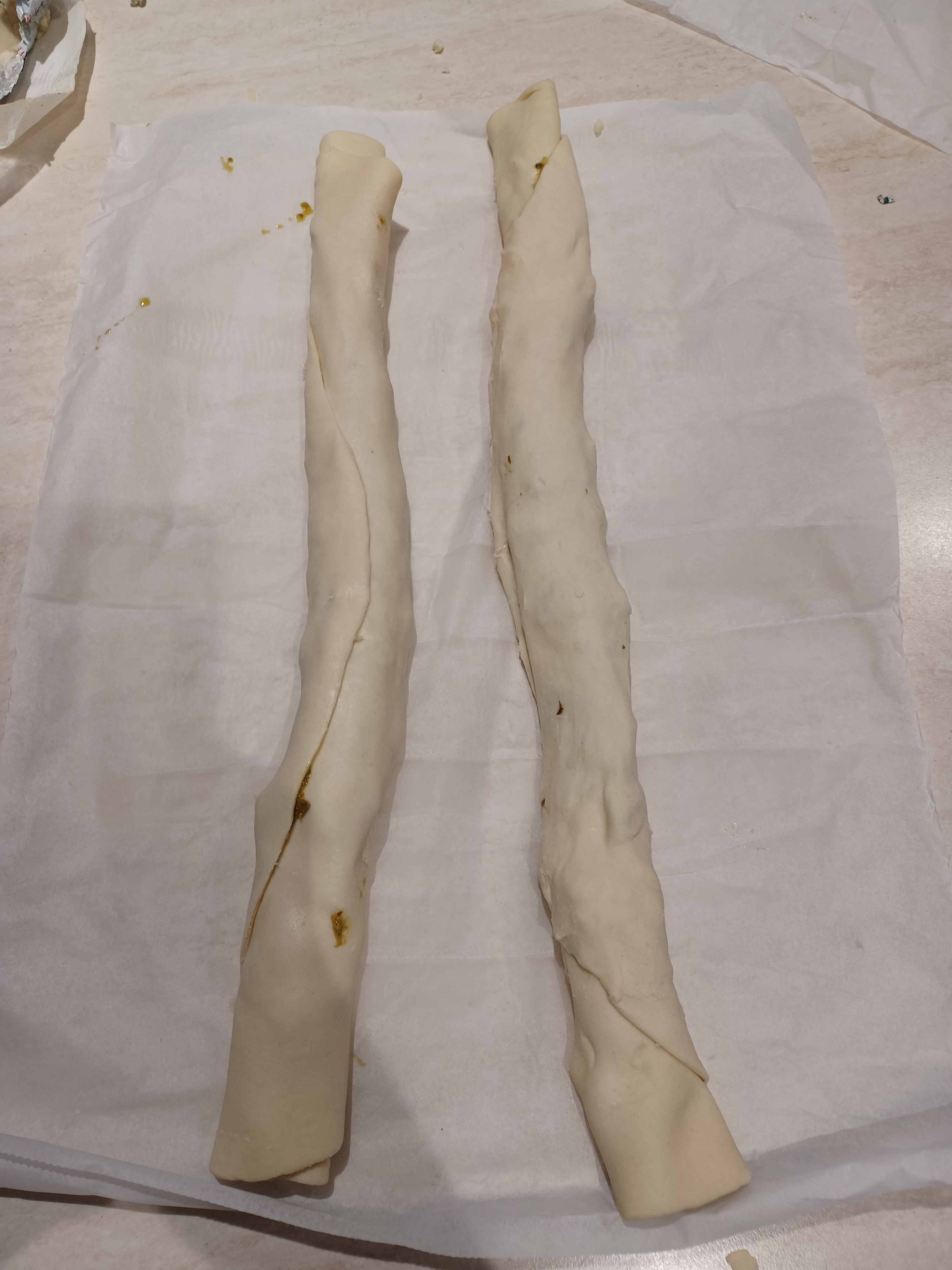 - Torsadez 2 bandes de pâtes entres elles. Faites de même avec les deux pâtes restantes.