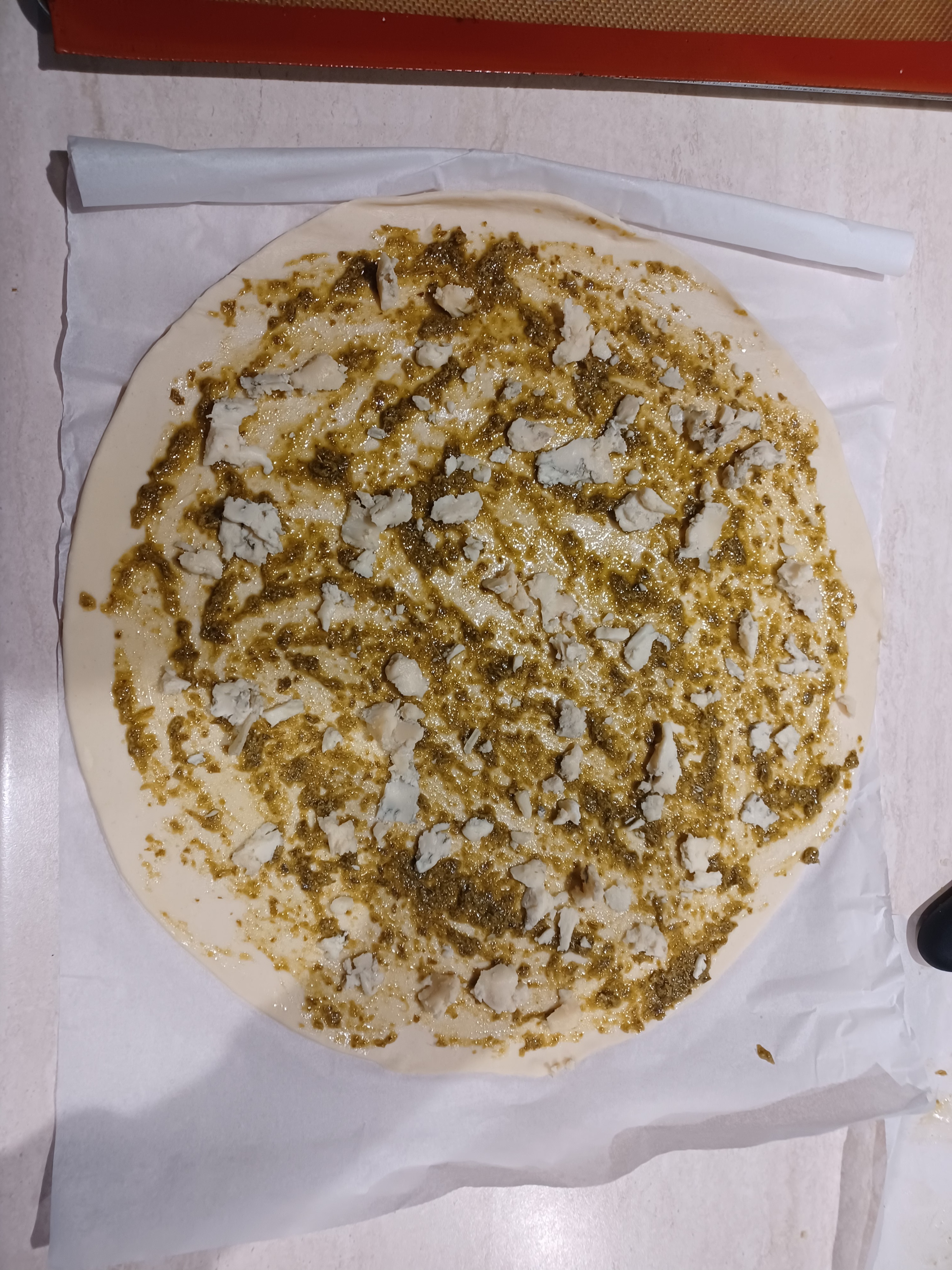 - Préchauffez le four th. 6 (180 °C). Déroulez les deux pâtes feuilletées et étalez sur chacune 2 cuillères à soupe de pesto.