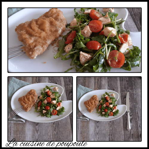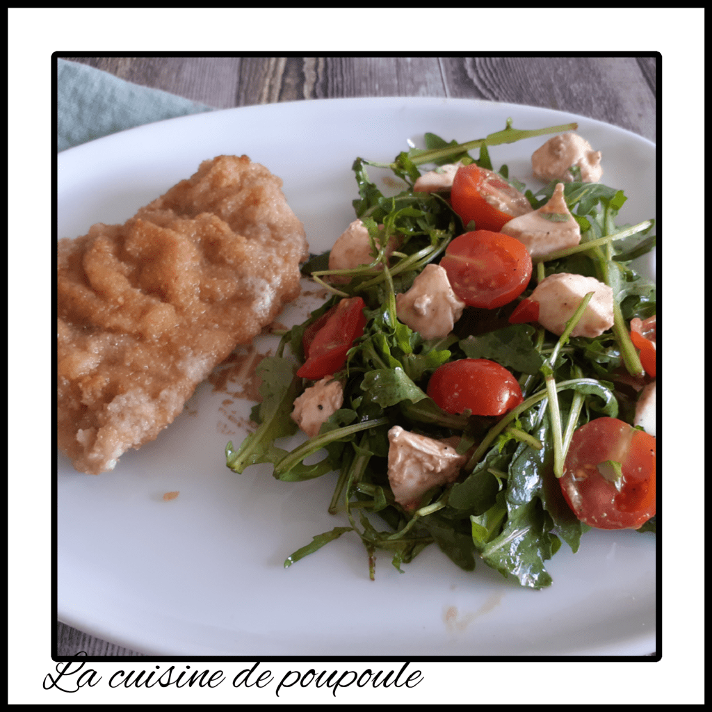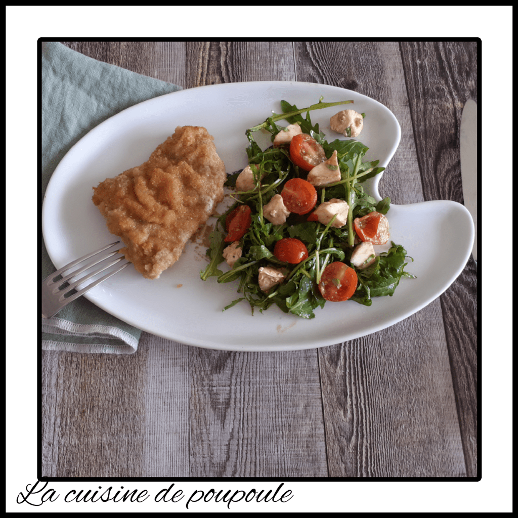 - Servez les escalopes avec la salade caprese, la roquette et une cuillerée de mayonnaise.
