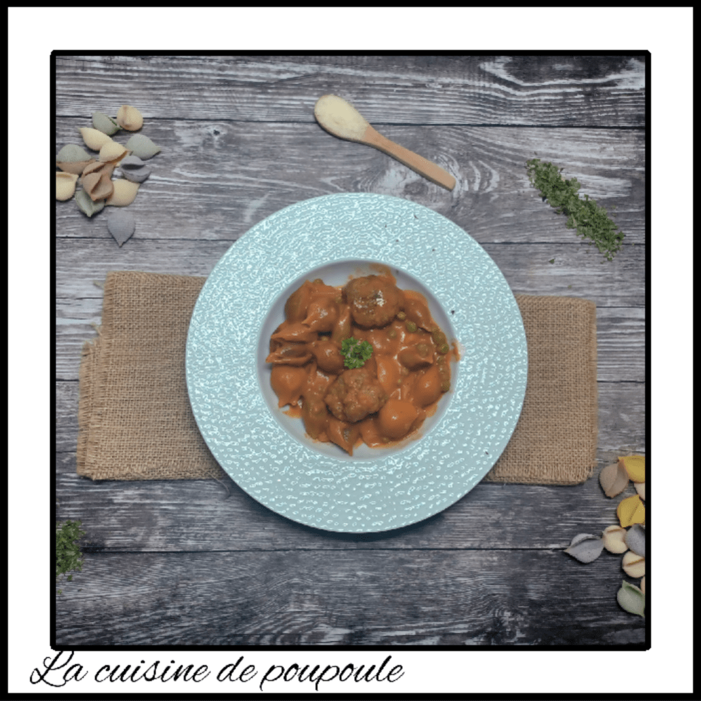 - Ajouter les boulettes de viande, les pâte Conghiglie (coquilles) crues, l’eau, la crème, les petits pois mélanger délicatement, couvrir et laisser mijoter sur feu doux pendant 15 minutes.